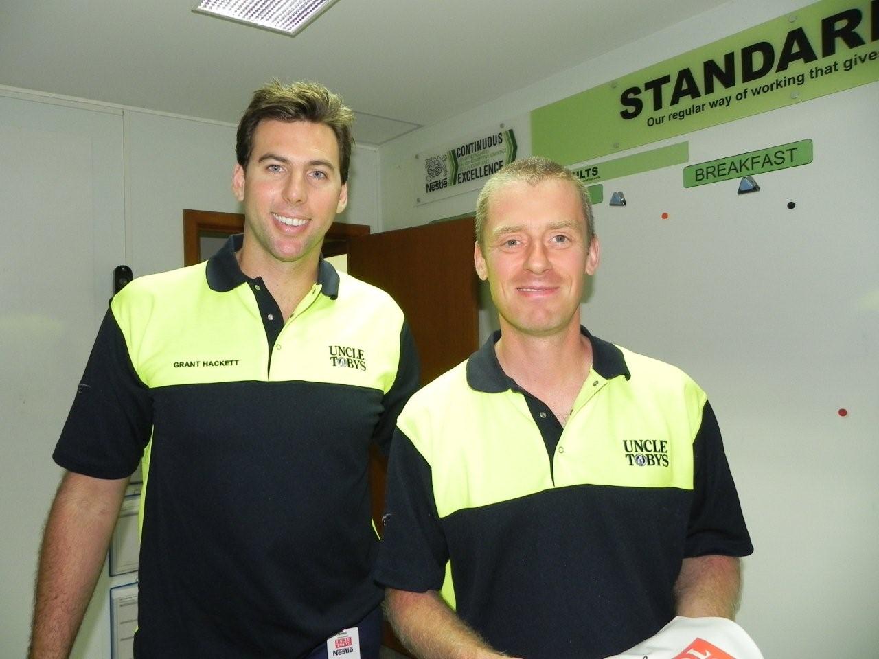 What a great picture - David meets swimming Ace - Grant Hackett (who promotes the Uncle Tobys products), we got him to personally sign a swimming cap for Grace. For those who don't know who GH is here's some info from wikipedia about him...